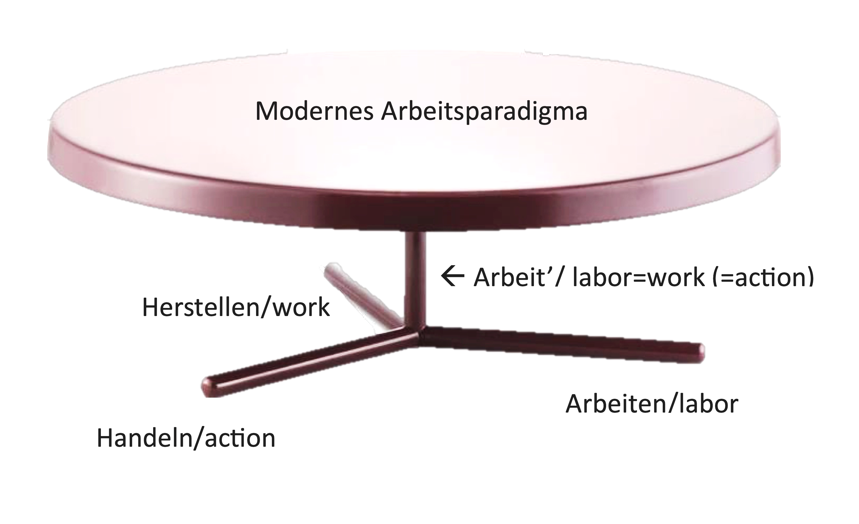 Es kann folgendermaßen gelesen werden: Stand das menschliche Tätigsein in der Antike und auch noch im Mittelalter auf drei „Füßen“: Arbeiten, Herstellen, Handeln, so „verschmilzt“ es in der Moderne quasi zu einem „Fuß“, einem Arbeitsbegriff, dass die Qualitäten der anderen Tätigkeiten einfaltet und synthetisiert. Ich schreibe den modernen Begriff der Arbeit hier als Arbeit´, um den Unterschied zu verdeutlichen; ich denke jedoch nicht, dass es generell notwendig ist, einen neuen Begriff dafür einzuführen. Die Arbeit´ ist das, was, wie oben thematisiert, auf Englisch meist mit work wiedergegeben wird und gleichzeitig eine Austauschbarkeit zu labor hegt. Und gleichzeitig ist es auch die einzige Stelle, an der das Handeln offiziell eingegliedert ist. Diese diskursiv eingeschmolzene Struktur bildet eine solide Grundlage, um die ganzen widersprüchlichen, aber auch durchaus totalitären Qualitäten des Arbeitsparadigmas zu tragen.